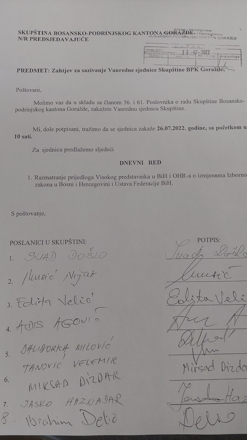 “Molimo vas da u skladu sa članom 56. i 61. Poslovnika o radu Skupštine BPK Goražde zakažete vanrednu sjednicu skupštine. Mi, dole potpisani tražimo da se sjednica zakaže 26.7. sa početkom u 10 sati. Za dnevni red sjednice predlažemo Razmatranje prijedloga Visokog predstavnika u BIH I OHR-a o izmjenama Izbornog zakona u BIH i Ustava Federacije BIH”, stoji u dopisu upućenom predsjedavajućoj Skupštine BPK Goražde sa potpisima osam zastupnika.