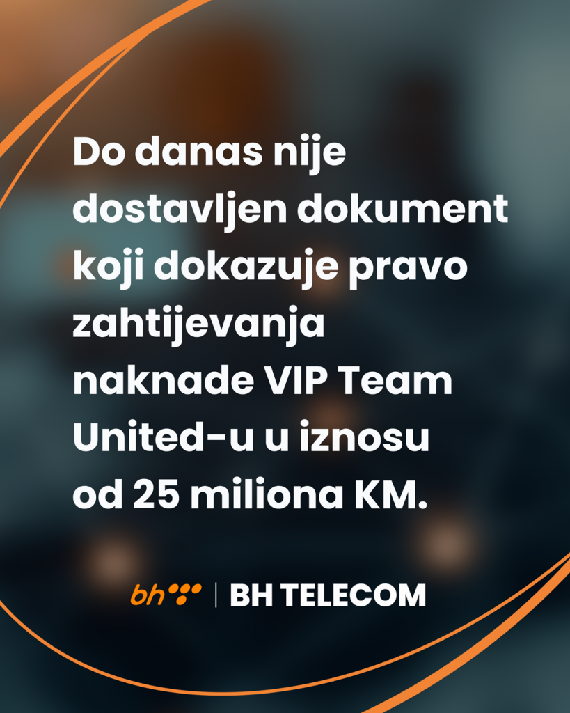 Naglašavamo da se u ovom slučaju radi o zahtjevima društva VIP Team United, sa sjedištem u Portugalu, koje se predstavlja kao ekskluzivni zastupnik određenih TV kuća i koje je prema BH Telecomu istaklo potraživanje u iznosu od 25 miliona KM, iako BH Telecom nema zaključen ugovor s navedenim društvom.